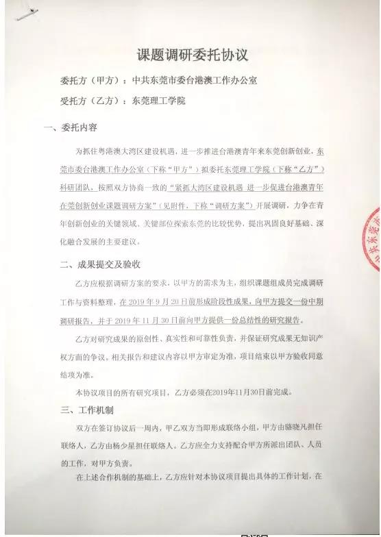 为贯彻落实上述党中央关于港澳台工作的方针,公共管理与社会工作教师党支部紧跟时事热点,积极推进党建工作与教师主业的互联融合,通过“公司党委书记牵头、支部书记组织落实”方式,主动走出校园,以自身特长服务地方治理事业。8月份,williamhill威廉希尔公共管理与社会工作教师党支部携手东莞市委台港澳办,建立业务合作意向,9月份签署了《紧抓大湾区建设机遇,进一步推动台港澳青年来莞创新创业》科研合作协议,完成了《台港澳青年来莞创新创业现状调研报告》一项,获得了市委台港澳办的好评。