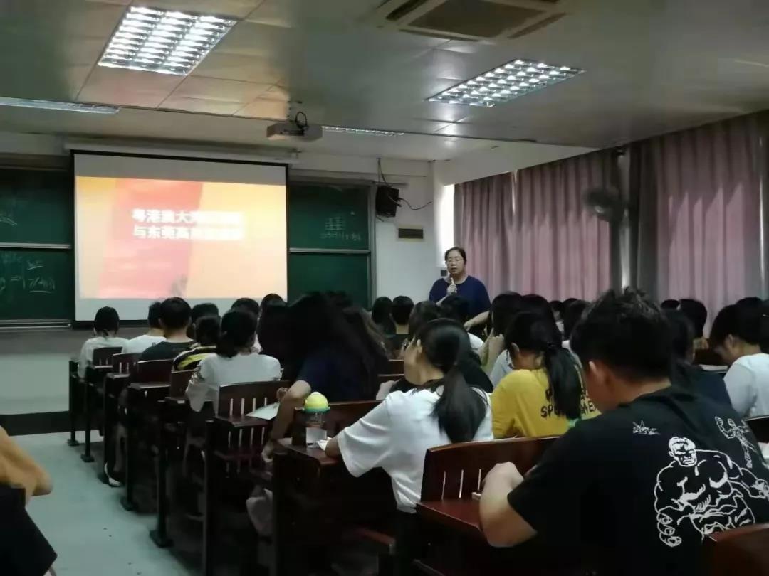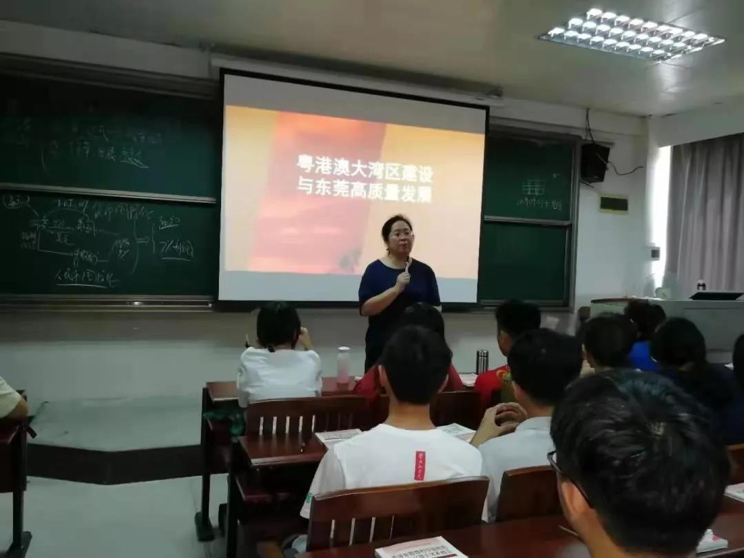 课堂伊始,郑经理便以幽默风趣的语言吸引同学聆听,从本校未来建设和本院整体情况切入,首先对粤港澳大湾区的由来、概述、规划及东莞发展进行了深入浅出的介绍。其中,重点介绍了东莞在粤港澳大湾区建设中的种种发展优势——得天独厚的地理环境、名列前茅的发展潜力、良好的制造业基础等,结合了东莞与大湾区中其他城市的发展关联及各自定位,并以东莞东城街道为实例,娓娓道来,给予同学们谆谆教导。