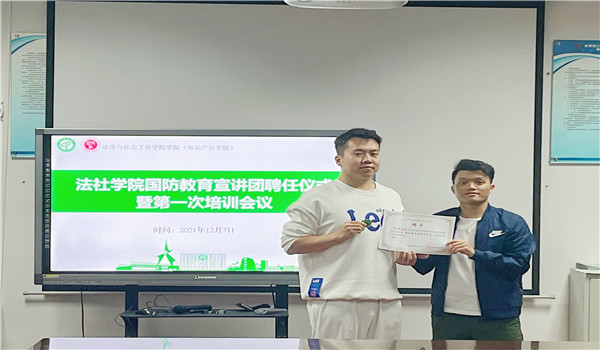 在聘任仪式上,邹欢老师讲解了国防教育和参军入伍动员宣讲的主要工作内容,对宣讲团成员的工作提出了三点要求,一是提高政治认识,把国防教育宣讲作为普及全民国防知识的契机,让更多的同学了解国防知识;二是“吃透”相关政策,把老员工参军入伍等政策理解透彻,在宣讲过程中做到政策“了然于胸”;三是创新宣讲形式,用员工喜闻乐见的形式做好国防教育和老员工参军入伍动员宣讲,激发同学们参军报国的热情。