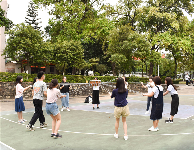 在比赛开始之前,工作人员先宣布了比赛规则。每队由11名同学组成,其中1名队长、10名队员,10名队员手拉雷霆鼓周围的绳子,将鼓原地拉起,队长负责将足球放在雷霆鼓上以及捡球。赛前练习时间为5分钟,正式比赛时间是3分钟。以颠球次数多者为胜。随后,一声哨响,比赛开始了,队长将足球稳定在鼓面上,足球随着雷霆鼓颠起,队员们左右移动、团结合作,如此不断循环往复。比赛结束后,工作人员公布了成绩,17级社会工作1班颠球50个、17级行政管理1班和2班颠球88个,犯规2次扣2球,最终成绩86个;16社会工作1班颠球41个、16行政管理1班和社会工作2班颠球48个。