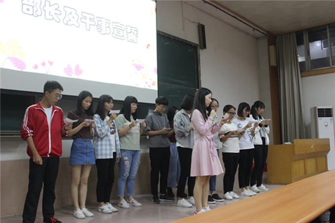在志愿站干事的主持开场下,全体成员观看了党的十九大的相关视频。随后,辅导员邱可荣上台讲话,强调责任、服务、主动的重要性,为团总支的发展指明方向。紧接着,各部门部长上台表述了自己对干事们未来工作的展望,作为部门代表的小干事们也畅谈了自身的感受及期待。然后,便迎来了神圣的干事宣誓仪式,让新干事有了很真实的感触。终于激动人心的游戏环节来了。“真假难辨”猜芥末饼干、“屁股写字”考验着成员们的默契,吹面粉找乒乓球的惩罚环节也是引得全场笑声不断。在这之后,常务副书记张喜劲进行会议总结,希望大家对工作认真负责,真正融入团总支大家庭。