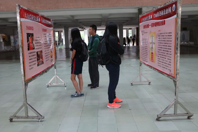 下午二时,陆陆续续有员工赶往教学楼,他们步伐匆匆,经过四号楼展板区时,也不禁停下匆忙的脚步在此驻足认真阅览展板。展板内容丰富,有的同学站立在一个展板前久久不动,双眼聚精会神地望着展板,似乎研究这其中的道理。后来,到展区阅览展板的人数越来越多,展区也越来越热闹,宣传宪法的活动似乎来到高潮 ,每个人都享受参与其中,受益其中。