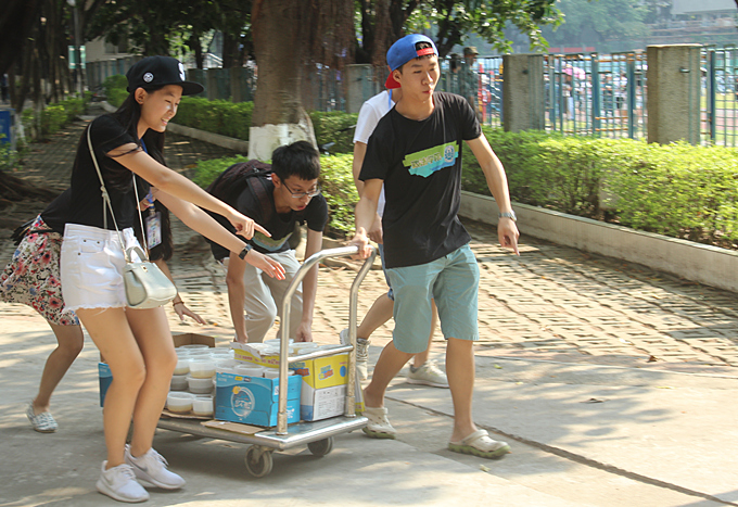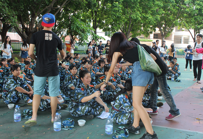9月24日,政法公司团学组织于莞城校区操场为大一军训新生送清凉——绿豆沙糖水。