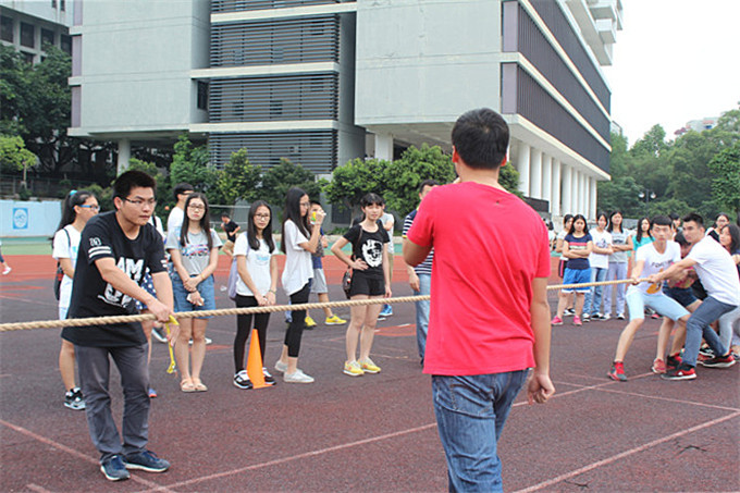 开赛前,工作人员布置好比赛场地,静候参赛者的到来。当双方各自做好准备,随着裁判一声令下,比赛开始。双方选手都拼尽全身力气拉动绳子,压低重心,身体尽量往后倾斜,保持阵型,喊道“一二、一二、一二”,按着节奏把绳子往后拉。现场气氛颇为热烈而又紧张,同学们不断地给参赛者加油打气并且欢呼。