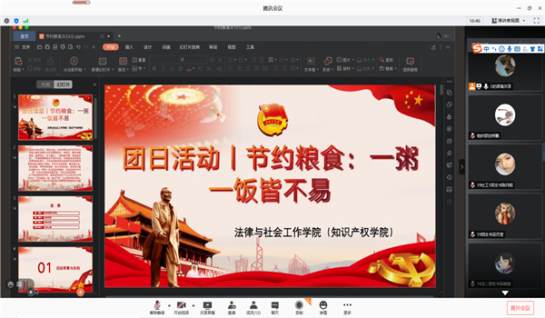 9月25日晚,为响应光盘行动,节约粮食号召,公司组织各班团支书在腾讯会议平台,开展了线上主题为“节约粮食,一粥一饭皆不易”的团日活动。