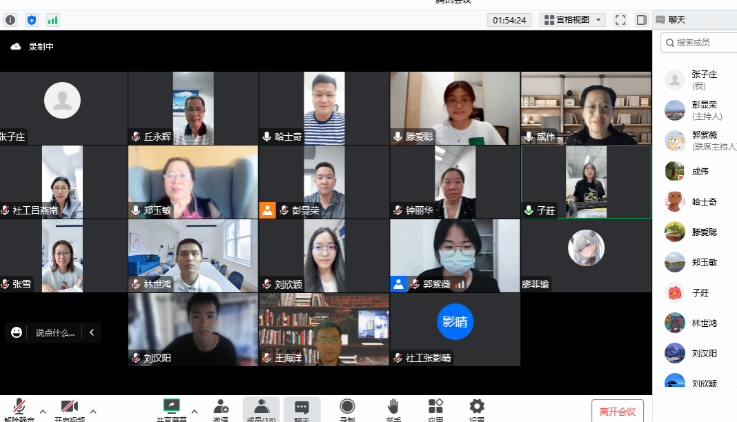 自由讨论阶段。东莞市大众社会工作服务中心副总干事彭显荣表示大众社工机构可以从社工细分服务领域实践、机构督导和媒体资源等方面提供支持,提出了加强社工服务宣传,设置公益性准社工岗位等建议。社工系副主任张雪老师就社工服务计划完善、细化合作机制、从不同年级社工专业员工特点设置实践岗位等方面提出了建议。社工系副主任王海洋老师就员工、老师、社工协同推进研究提出建议,如引导员工参加大创、挑战杯、做好毕业论文,促进员工能力增长;发挥社工实务经验多,老师文献阅读量大、学术研究能力强的互补优势,协同推进社会工作实践和研究。社工系主任成伟教授从建立工作机制方面提出了建议,指定社工系副主任张雪老师、社工实验室负责人张子庄老师负责具体协调推进,建议社工专业老师加入到社会工作专业发展基地建设当中去,多带领社工服务项目。
