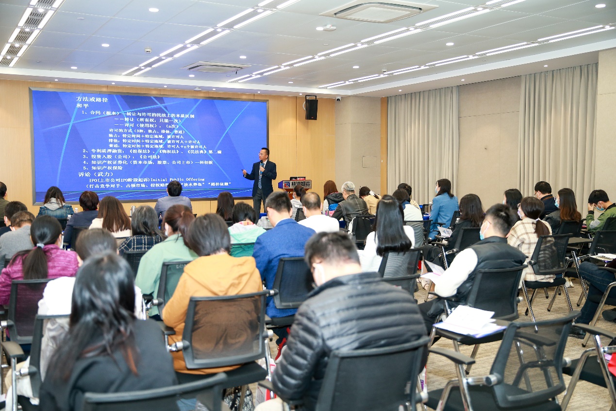 龚红兵老师围绕《知识产权运营中的相关法律问题——以<民法典>为视角》进行主题授课,从法学的角度向学员们讲解知识产权运营中法律问题的核心——转让与许可,介绍了知识经济时代的主要特点,从科技成果转让、许可和作价投资等方面讲解了如何开展知识产权运营,并从《民法典》的角度介绍了知识产权运营的法律根基——合同法的基础知识。在讲授涉及合同法的知识产权纠纷的内容时,运用歌手杨臣刚《老鼠爱大米》的歌曲版权产生争议的案例,剖析知识产权运营中有关合同法的法律问题,让学员们充分理解法学在知识产权纠纷中的运用,体会法学知识在解决知识产权纠纷问题的重要作用。