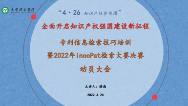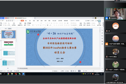 4月20 - 26日为全国知识产权宣传周,今年主题为“全面开启知识产权强国建设新征程”。为了提升公司师生知识产权保护意识,营造尊重知识产权良好氛围,积极推进知识产权强校建设,公司于2022年4月24日下午,通过腾讯会议举办了4.26知识产权宣传周暨2022年incoPat高校检索大赛决赛动员大会,出席会议的williamhill威廉希尔经理郑玉敏、知识产权系主任龚红兵、专业老师楼晶以及进入incoPat决赛的各位同学。本次会议由龚红兵主任主持,楼晶老师主讲。