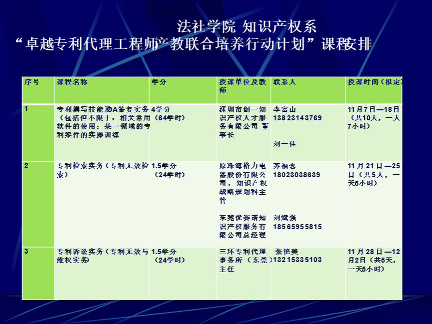 在此次“卓越专利代理工程师班”的开班动员大会中,知识产权系系主任龚红兵重点介绍了“卓越专利代理工程师班”的课程计划、任课教师及课程安排。任课老师均来自知识产权实务界,其中,课程《专利撰写技能及OA答复实务》的老师均来自深圳市创一知识产权人才服务公司;课程《专利诉讼实务》的任课老师是广州三环专利代理事务所的张艳美律师;课程《专利检索与应用》的任课老师由原珠海格力电器股份有限公司知识产权部的苏福念老师担任。
